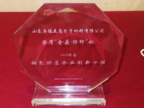 2020年9月7日,由烟草包装行业信息委员会及《烟草包装》杂志主办的“金鼎·纺印”杯“15周年烟草包装系列评选活动”颁奖盛典在上海隆重开启。经多方综合评选,山东奥德美高分子材料有限公司被烟草包装行业信息委员会授予“2019年度烟包供应企业创新十强”称号。